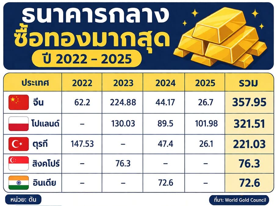 - อันดับ 2 ธนาคารกลางโปแลนด์ รวม 321.51 ตัน เป็นธนาคารกลางซื้อทองคำมากที่สุดในปี 2024–2025