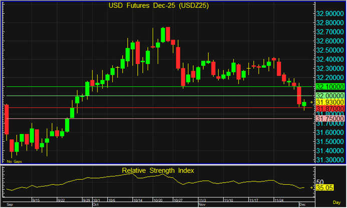 ราคา USDZ25 มีแนวโน้มฟื้นตัวขึ้นอีกครั้ง แต่ประเมินว่าราคาอาจกลับมาเคลื่อนตัวในกรอบ 31.87-32.00 บาท จึงแนะนำเปิด Short หากราคาขึ้นทดสอบกรอบบนที่ระดับ 32.00 บาท และเปิด Long หากราคาลงทดสอบแนวรับที่ระดับ 31.87 บาท