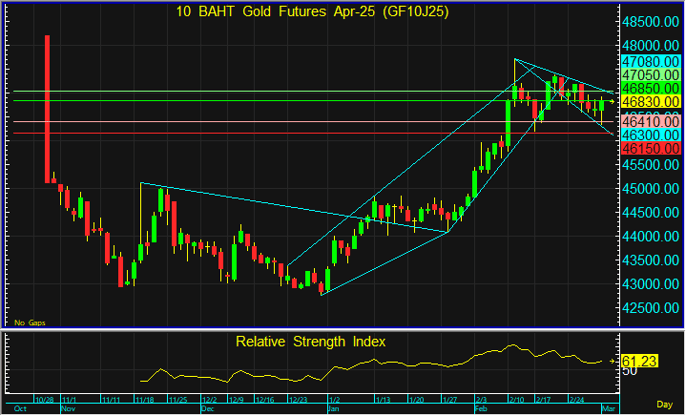 GF10J25 สามารถฟื้นตัวกลับจากแนวรับสำคัญได้อีกครั้ง แต่ยังคงประเมินว่ามีโอกาสที่ราคาจะย่อตัวลงจากแนวต้านดังกล่าว จึงแนะนำรอเปิด Short ที่แนวต้านที่ 46,850 บาท โดยมีเป้าหมายทำกำไรที่ 46,400 บาท และตัดขาดทุนหากทะลุแนวต้านที่ 47,050 บาทขึ้นไป