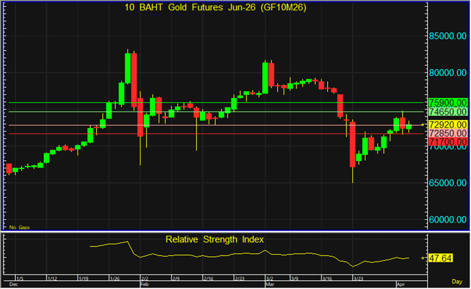 GF10J26 อาจ Sideway ตามทองโลกและค่าเงินบาท จึงแนะนำทยอยเปิด Long จากระดับ 72,850 บาท โดยมีเป้าหมายทำกำไรที่ระดับ 74,650 บาท และตัดขาดทุนหากราคาทะลุระดับ 71,700 บาทลงไป