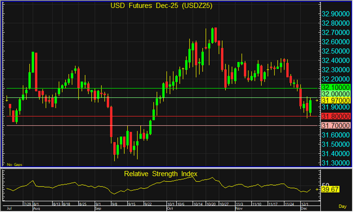 ราคา USDZ25 ฟื้นตัวขึ้นจากแนวรับ แต่ประเมินว่าราคายังอาจเคลื่อนตัวในกรอบ 31.80-32.00 บาท จึงแนะนำเปิด Short หากราคาขึ้นทดสอบกรอบบนที่ระดับ 32.00 บาท และเปิด Long หากราคาลงทดสอบแนวรับที่ระดับ 31.80 บาท