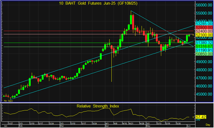 GF10M25 ที่ขึ้นทดสอบแนวต้านที่ระดับ 52,400 บาท อาจต้องเผชิญแรงขายอีกครั้ง จึงแนะนำรอเปิด Short จากแนวต้านดังกล่าว โดยมีเป้าหมายทำกำไรที่ระดับ 51,300 บาท และตัดขาดทุนหากราคาทะลุแนวต้านที่ระดับ 52,800 บาทขึ้นไป