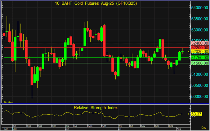 ราคา GF10Q25 เริ่มย่อตัวลง หลังขึ้นทดสอบแนวต้านสำคัญที่ระดับ 52,200 บาท จึงแนะนำไล่เปิด Short โดยมีเป้าหมายทำกำไรที่ระดับ 51,750 บาท และตัดขาดทุนหากราคาทะลุแนวต้านแรกที่ระดับ 52,200 บาทขึ้นไป