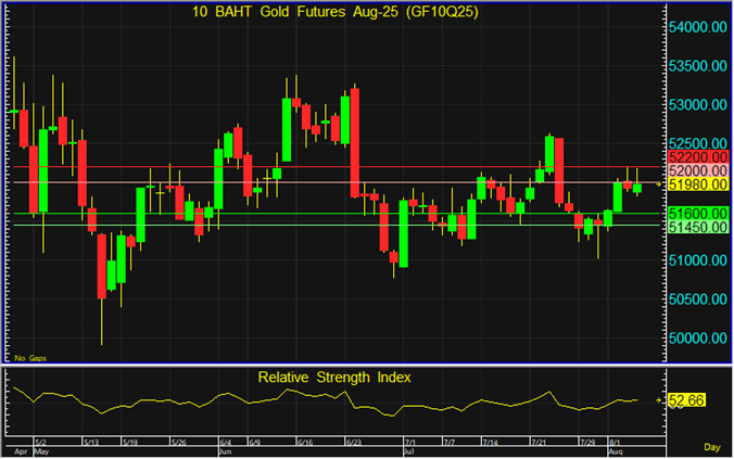 ราคา GF10Q25 เริ่มย่อตัวลง หลังขึ้นทดสอบแนวต้านสำคัญที่ระดับ 52,200 บาท จึงแนะนำรอเปิด Short จากแนวต้านที่ระดับ 52,000 บาท โดยมีเป้าหมายทำกำไรที่ระดับ 51,600 บาท และตัดขาดทุนหากราคาทะลุแนวต้านที่ระดับ 52,200 บาทขึ้นไป