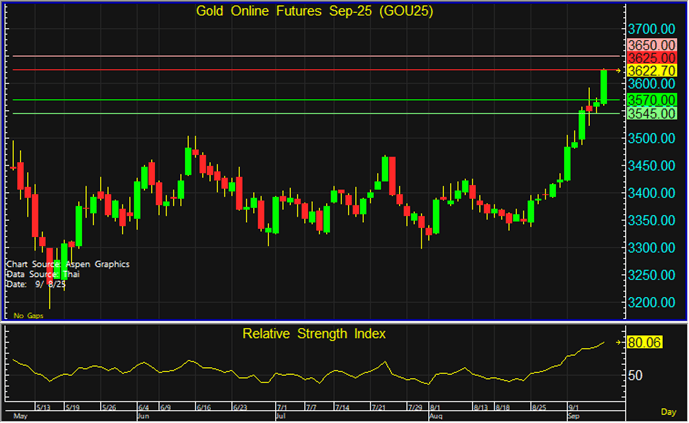 แม้ราคา GOU25 จะเร่งตัวขึ้น แต่ในช่วงเช้าราคายังต้องเผชิญกับแนวต้านสำคัญที่ระดับ 3,625 ดอลลาร์ โดยมีเป้าทำกำไรที่ระดับ 3,570 ดอลลาร์ และตัดขาดทุนหากราคาทะลุแนวต้านที่ 3,650 ดอลลาร์ขึ้นไป