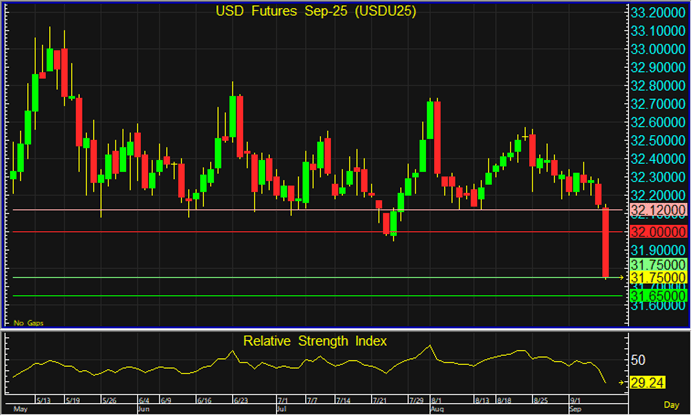 USDU25 ที่ปรับฐานลง อาจสามารถฟื้นตัวขึ้นจากแนวรับสำคัญที่ระดับ 31.75 บาทได้อีกครั้ง จึงแนะนำรอเปิด Long จากแนวรับดังกล่าว โดยมีเป้าหมายทำกำไรที่ระดับ 32.00 บาท และตัดขาดทุนหากราคาทะลุแนวรับที่ 31.65 บาทลงไป