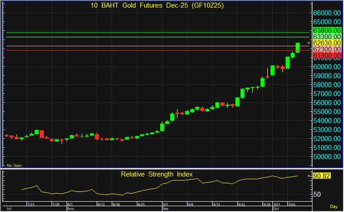ราคา GF10Z25 สามารถฟื้นตัวกลับ และเร่งตัวขึ้นอีกครั้ง จึงแนะนำไล่เปิด Long โดยมีเป้าทำกำไรที่ระดับ 63,300 บาท และตัดขาดทุนหากราคาหลุดแนวรับแรกที่ระดับ 62,300 บาทลงไป