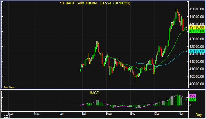 GF10Z24 ฟื้นตัวขึ้น หลังยืนเหนือเส้น SMA20 ทั้งนี้คาดว่าอาจปรับตัวขึ้นได้ต่อ แต่อาจจะไม่มากนัก และให้ระวังแรงเทขายหากไม่ผ่านบริเวณ 44,070 บาท ให้เปิด Short position บริเวณ 44,070 บาท โดยมีจุดตัดขาดทุนที่ 44,220 บาท