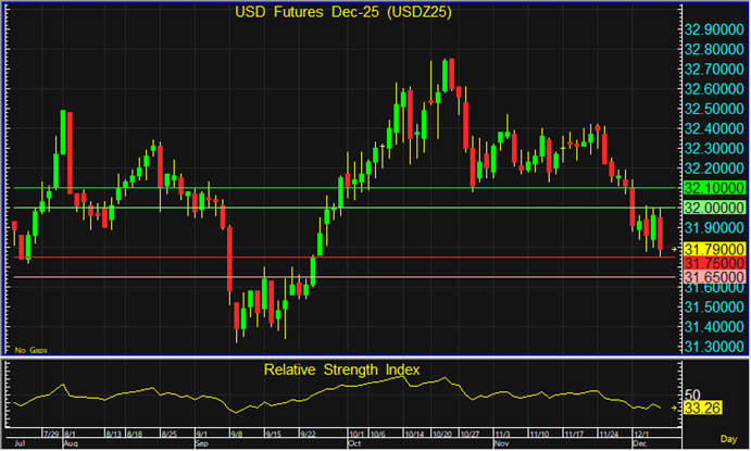 ราคา USDZ25 ลงทดสอบแนวรับ แต่ประเมินว่าราคายังอาจเคลื่อนตัวในกรอบ 31.75-32.00 บาท จึงแนะนำเปิด Short หากราคาขึ้นทดสอบกรอบบนที่ระดับ 32.00 บาท และเปิด Long หากราคาลงทดสอบแนวรับที่ระดับ 31.75 บาท