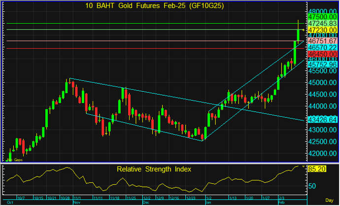 GF10G25 ขึ้นทำจุดสูงสุดเป็นประวัติการณ์ ที่ระดับ 47,650 บาท ซึ่งเป็นระดับของแนวต้านของราคาทองโลกด้วย แต่ประเมินว่ามีโอกาสที่ราคาอาจปรับตัวลง จึงแนะนำเปิด Short ที่ระดับ 47,250 บาท โดยมีเป้าหมายทำกำไรที่ 46,750 บาท และตัดขาดทุนหากราคาทะลุระดับ 47,500 บาท