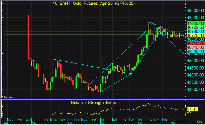 ราคาทองโลกถูกกดดันจากเส้นค่าเฉลี่ย 200 ชั่วโมง ซึ่งอยู่ที่ระดับ 2,900 ดอลลาร์ แต่ราคา GF10J25 ได้แรงหนุนจากค่าเงินบาทที่อ่อนค่าลงแรง ราคาจึงยังซื้อขายกันอยู่บริเวณแนวต้าน แต่ราคาอาจผ่านแนวต้านนี้ขึ้นไปได้ยาก จึงแนะนำรอเปิด Short ที่แนวต้านที่ระดับ 46,800 บาท โดยมีเป้าหมายทำกำไรที่ 46,200 บาท และตัดขาดทุนหากราคาทะลุแนวต้านที่ระดับ 47,050 บาทขึ้นไป