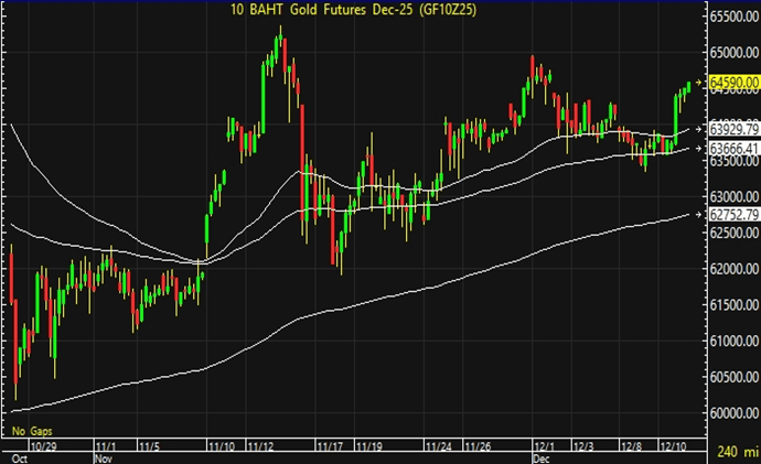 ราคา GF10Z25 มีแนวโน้มเร่งตัวขึ้นอีกครั้ง จึงแนะนำไล่เปิด Long โดยมีเป้าหมายทำกำไรที่ระดับ 65,000 บาท และตัดขาดทุนหากราคาหลุดแนวรับแรกที่ระดับ 64,200 บาทลงไป
