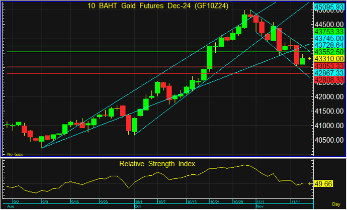 GF10Z24 ปรับตัวลงจากการแข็งค่าของสกุลเงินดอลลาร์และการพุ่งขึ้นของอัตราผลตอบแทนพันธบัตรเป็นปัจจัยกดดันตลาด แต่ประเมินว่าอาจมีการฟื้นตัวสั้นๆ โดยมี Upside ค่อนข้างจำกัด แนะนำรอ Long สัญญา GF10Z24 ที่ 43,050 บาท โดยมีเป้าทำกำไรที่ 43,550 บาท และตัดขาดทุนหากทะลุระดับ 42,800 บาท