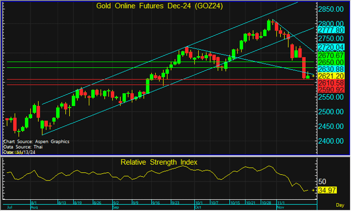 GOZ24 ประเมินว่าระยะสั้นยังมีแนวโน้มลงต่อ โดยมีแนวรับสำคัญอยู่ที่ 2,610 $ ซึ่งราคาอาจฟื้นตัวกลับได้อีกครั้ง แต่ Upside ค่อนข้างจำกัด แนะนำรอ Long สัญญา GOZ24 ที่ 2,610 $ โดยมีเป้าทำกำไรที่ 2,650 $ และตัดขาดทุนหากทะลุระดับ 2,590 $