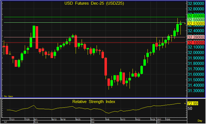 แม้ราคา USDZ25 จะปรับตัวขึ้นมา แต่ประเมินว่าราคาอาจผ่านแนวต้านที่ระดับ 32.55 บาทได้ยาก จึงแนะนำรอเปิด Short จากแนวต้านดังกล่าว โดยมีเป้าทำกำไรที่ระดับ 32.28 บาท และตัดขาดทุนหากราคาทะลุแนวต้านที่ 32.65 บาทขึ้นไป