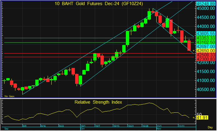 GF10Z24 ถูกกดดันจากค่าเงินสกุลดอลลาร์ที่แข็งค่าต่อเนื่อง จนสามารถทะลุต้านที่ระดับ 106 ส่งผลให้ GF10Z24 หลุดแนวรับลงมา แนวโน้มในระยะสั้นจึงกลับมาอยู่ในขาลง แนะนำไล่ Short สัญญา GF10Z24 โดยมีเป้าทำกำไรที่ 42,300-42,500 บาท และตัดขาดทุนหากทะลุระดับ 43,100 บาท