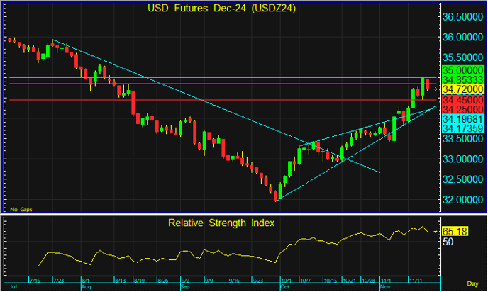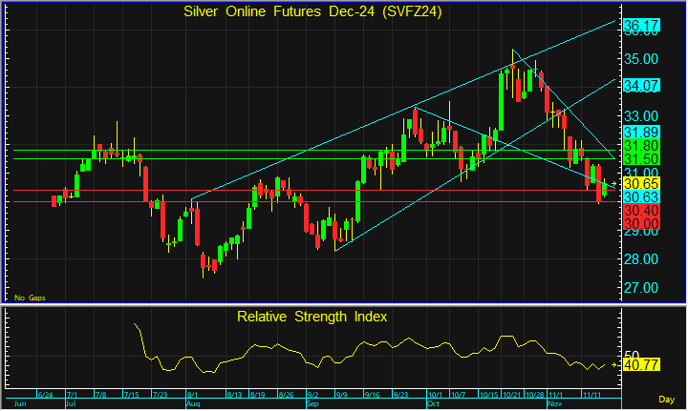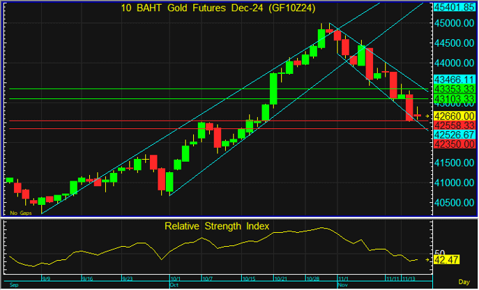 GF10Z24 ถูกกดดันจากค่าเงินสกุลดอลลาร์ที่แข็งค่าต่อเนื่องตอบรับผลการเลือกตั้ง แต่หลังลงทดสอบแนวรับสำคัญที่ 42,550 บาท ดูเริ่มมีแรงซื้อกลับเข้าหนุนราคาอีกครั้ง แนะนำรอ Long สัญญา GF10Z24 ที่ 42,550 บาท โดยมีเป้าทำกำไรที่ 43,100 บาท และตัดขาดทุนหากทะลุระดับ 42,350 บาท