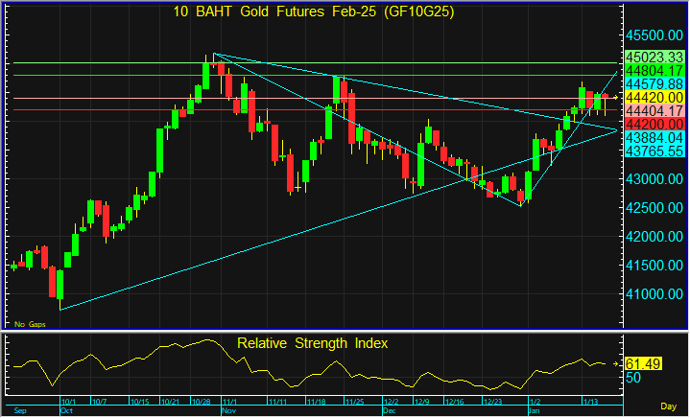 ราคา GF10G25 ถูกกดดันจากค่าเงินบาท แม้ราคาทองโลกจะเริ่มปรับขึ้นมาแล้วในช่วงเช้านี้ โดยยังแนะนำใช้กลยุทธ์เชิงรับในการรอเปิด Long สัญญา GF10G25 ที่ 44,400 บาท โดยมีเป้าทำกำไรที่ 44,800 บาท และตัดขาดทุนหากทะลุระดับ 44,200 บาท