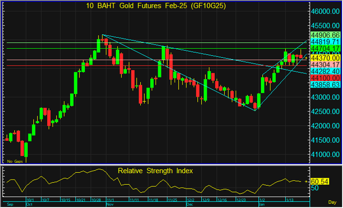 GF10G25 ที่ปรับตัวขึ้นมาจากแนวโน้มที่ Fed อาจกลับมาทบทวนการปรับลดดอกเบี้ยในปีนี้ลงอีกครั้ง แต่ยังถูกค่าเงินบาทกดดัน จึงแนะนำใช้ กลยุทธ์เชิงรับในการรอเปิด Long สัญญา GF10G25 ที่ 44,300 บาท โดยมีเป้าทำกำไรที่ 44,700 บาท และตัดขาดทุนหากทะลุระดับ 44,100 บาท