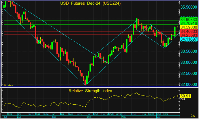 USDZ24 เร่งตัวขึ้นจากการที่ตลาดประเมินว่า ธนาคารกลางสหรัฐฯ (เฟด) อาจปรับลดอัตราดอกเบี้ยในปีหน้าลงเพียง 0.50% หลังจากก่อนหน้ามีการคาดการณ์ไว้ที่ 0.75% จึงแนะนำรอเปิด Short สัญญา USDZ24 ที่ 34.70 บาท โดยมีเป้าทำกำไรที่ 34.40 บาท และตัดขาดทุนหากทะลุระดับ 34.90 บาท