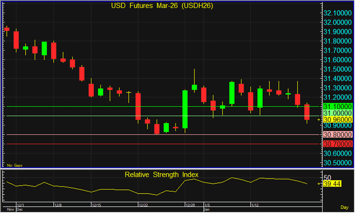 ราคา USDH26 เริ่มย่อตัวลงจนหลุดแนวรับ จึงกลับมาแนะนำรอเปิด Short จากแนวต้านที่ระดับ 31.00 บาท โดยมีเป้าทำกำไรที่ระดับ 30.80 บาท และตัดขาดทุนหากราคาทะลุแนวต้านที่ระดับ 31.10 บาทขึ้นไป