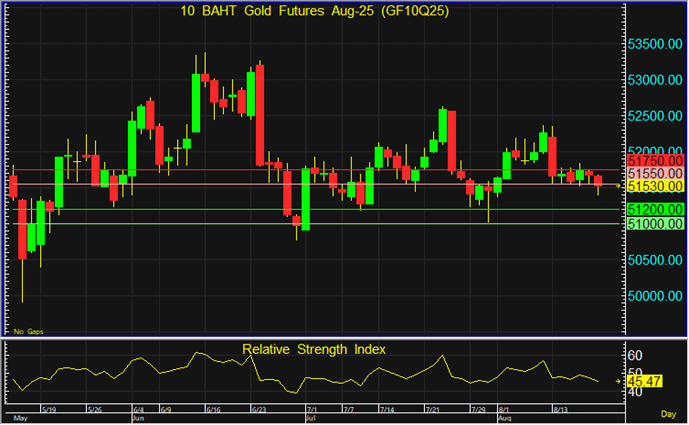 GF10Q25 หลุดระดับสำคัญที่ 51,550 บาทลงมา เริ่มมีการฟื้นตัวสั้นๆ จึงแนะนำรอเปิด Short ที่ระดับ 51,550 บาท โดยมีเป้าทำกำไรที่ 51,200 บาท และตัดขาดทุนหากราคาทะลุแนวต้านที่ระดับ 51,750 บาทขึ้นไป