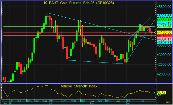ราคา GF10G25 ที่ปรับตัวลงไป มีแรงซื้อกลับขึ้นมา จนเกิดรูปแบบ Hammer ซึ่งราคามักฟื้นตัวกลับหลังเกิดรูปแบบดังกล่าว จึงแนะนำรอเปิดสถานะ Long สัญญา GF10G25 ที่ 44,150 บาท โดยมีเป้าทำกำไรที่ 44,450 บาท และตัดขาดทุนหากทะลุระดับ 44,000 บาท