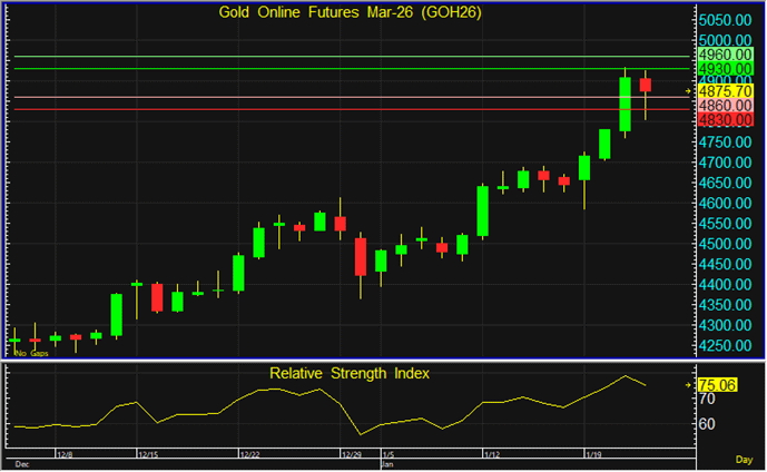 ราคา GOH26 ที่ย่อตัวลงแรงในช่วงเช้า เริ่มฟื้นตัวกลับอีกครั้ง แต่ยังแนะนำรอเปิด Long จากแนวรับที่ระดับ 4,860 ดอลลาร์ โดยมีเป้าหมายทำกำไรที่ระดับ 4,930 ดอลลาร์ และตัดขาดทุนหากราคาหลุดแนวรับที่ระดับ 4,830 ดอลลาร์ลงไป