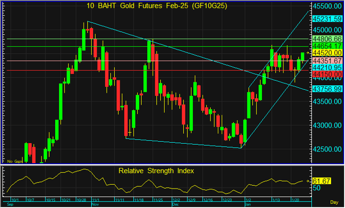 GF10G25 ได้รับแรงหนุนจากการเข้าซื้อของนักลงทุนในฐานะสินทรัพย์ปลอดภัย แต่ระยะสั้นประเมินว่าอาจยังไม่สามารถผ่านต้านที่ระดับ 44,500 บาท จึงแนะนำกลับมาใช้กลยุทธ์เชิงรับรอเปิด Long สัญญา GF10G25 ที่ 44,350 บาท โดยมีเป้าทำกำไรที่ 44,650 บาท และตัดขาดทุนหากทะลุระดับ 44,150 บาท