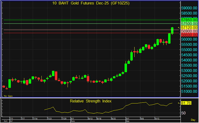 ราคา GF10Z25 ยังคงมีแนวโน้มปรับตัวขึ้นต่อ จึงแนะนำไล่เปิด Long โดยมีเป้าทำกำไรที่ระดับ 57,500 บาท และตัดขาดทุนหากราคาทะลุแนวรับแรกที่ระดับ 56,900 บาทลงไป