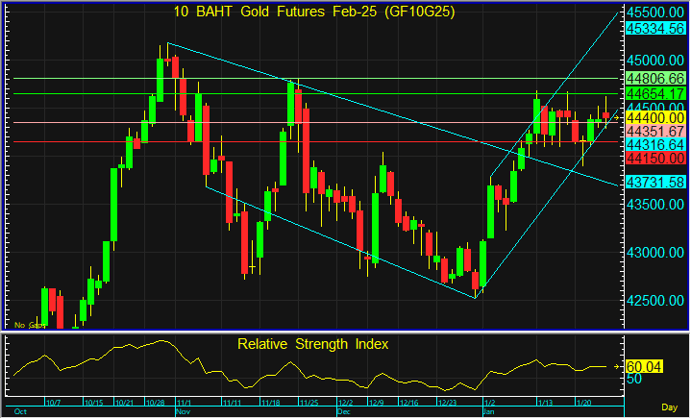 GF10G25 ยังคงเคลื่อนตัวในแนวโน้ม Sideway Up แม้ว่าราคาอาจจะยังไม่สามารถทะลุแนวต้านที่ 44,650 บาทขึ้นไป โดยหลังเกิดรูปแบบ Hammer ดูเหมือนราคาจะมีโอกาสฟื้นตัวขึ้นได้ต่อ แต่แนะนำรอเปิด Long สัญญา GF10G25 ที่ 44,350 บาท โดยมีเป้าทำกำไรที่ 44,650 บาท และตัดขาดทุนหากทะลุระดับ 44,150 บาท