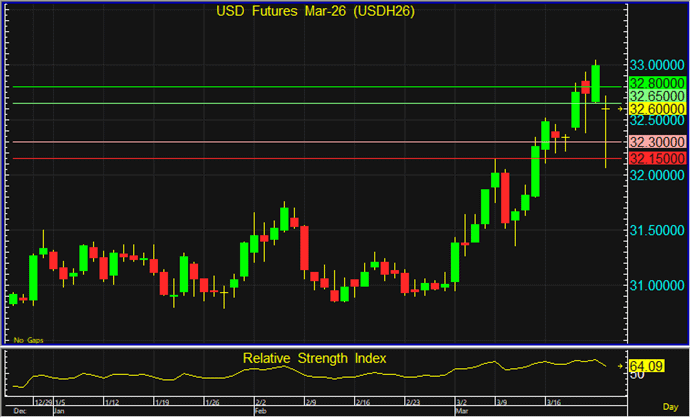 USDH26 แนะนำรอเปิด Short จากระดับ 32.65 บาท โดยมีเป้าหมายทำกำไรที่ระดับ 32.30 บาท และตัดขาดทุนหากราคาทะลุระดับ 33.80 บาท ขึ้นไป