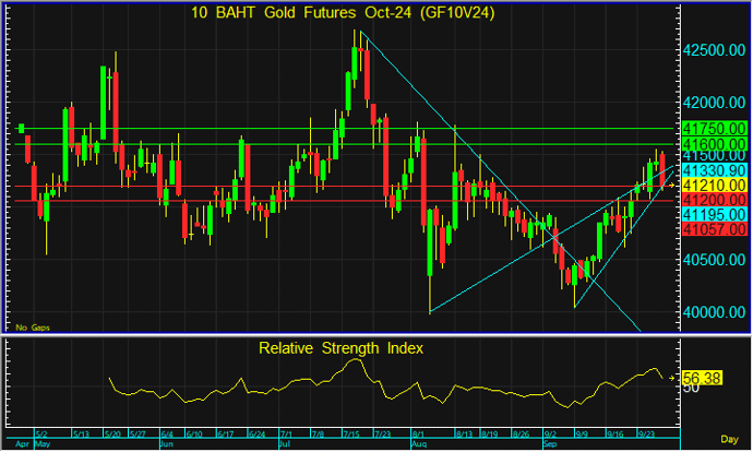 GF10V24 ปรับตัวขึ้นทดสอบแนวต้านที่ 41,600 บาท แต่ยังไม่สามารถผ่านขึ้นไปได้ ล่าสุดราคาลงทดสอบแนวรับที่ 41,200 บาท ประเมินว่าราคาอาจฟื้นตัวกลับจากแนวรับดังกล่าว แนะนำรอ Long สัญญา GF10V24 ที่ 41,200 บาท โดยมีเป้าทำกำไรที่ 41,600-41,750 บาท และตัดขาดทุนหากทะลุแนวรับที่ 41,050 บาท