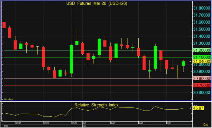 ค่าเงินบาทเริ่มฟื้นตัวขึ้นอีกครั้ง แต่ประเมินว่าราคาอาจยังไม่สามารถผ่านแนวต้านที่ระดับ 31.10 บาทขึ้นไป จึงแนะนำรอเปิด Short จากแนวต้านดังกล่าว โดยมีเป้าหมายทำกำไรที่ระดับ 30.80 บาท และตัดขาดทุนหากราคาทะลุแนวต้านที่ระดับ 31.20 บาทขึ้นไป