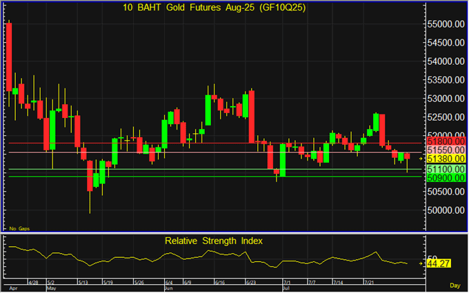 ราคา GF10Q25 ที่ฟื้นตัวขึ้นมา เริ่มย่อตัวลงจากแนวต้านสำคัญที่ระดับ 51,550 บาท ซึ่งประเมินว่าราคาอาจผ่านขึ้นไปได้ยาก จึงแนะนำรอเปิด Short จากแนวต้านดังกล่าว โดยมีเป้าทำกำไรที่ 51,100 บาท และตัดขาดทุนหากราคาทะลุแนวต้านที่ระดับ 51,800 บาทขึ้นไป