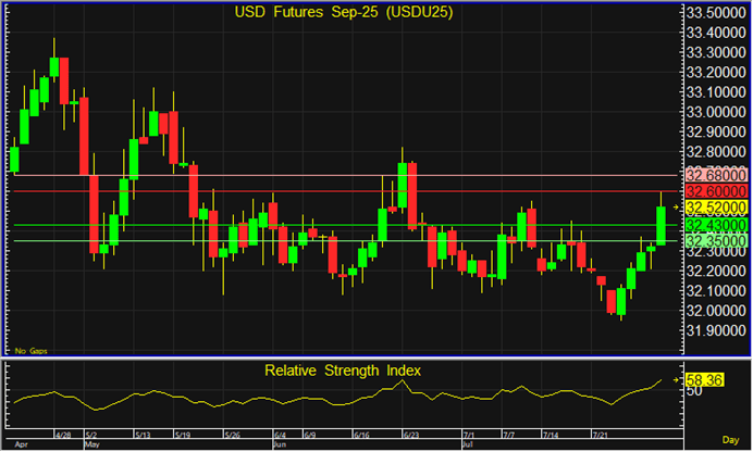 USDU25 ทะลุแนวต้านขึ้นมา แต่ราคายังคงถูกกดดันจากแนวต้านสำคัญที่ระดับ 32.60 บาท จึงกลับมาแนะนำไล่เปิด Short แม้ Downside อาจเริ่มเหลือน้อยแล้ว โดยมีเป้าหมายทำกำไรที่ระดับ 32.35-32.43 บาท และตัดขาดทุนหากราคาทะลุแนวต้านแรกที่ระดับ 32.60 บาทขึ้นไป