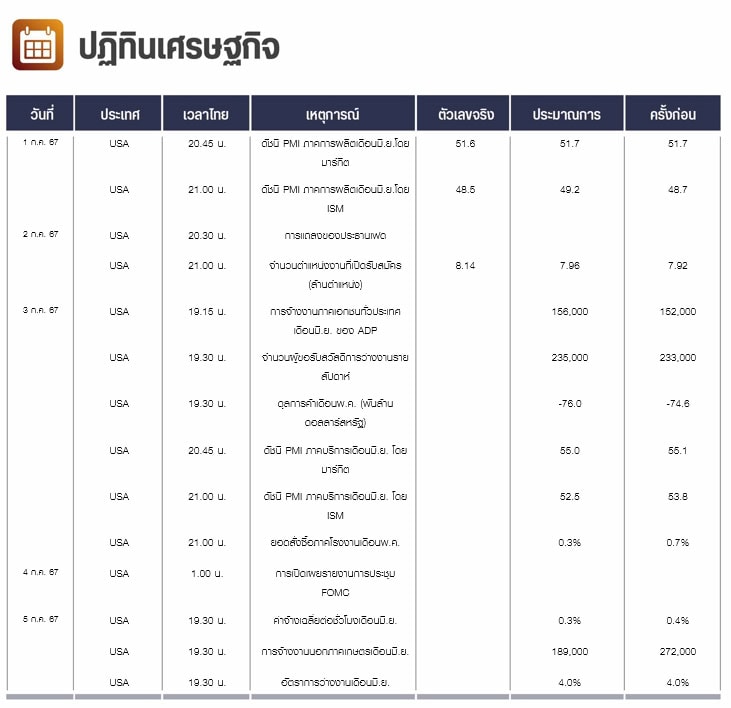 คืนนี้สหรัฐจะมีการเปิดเผยตัวเลขเศรษฐกิจที่สำคัญหลายตัว ได้แก่ การจ้างงานภาคเอกชนทั่วประเทศเดือนมิ.ย. ของ ADP จำนวนผู้ขอรับสวัสดิการว่างงานรายสัปดาห์ ดุลการค้าเดือนพ.ค. ดัชนี PMI ภาคบริการเดือนมิ.ย. โดย ISM และยอดสั่งซื้อภาคโรงงานเดือนพ.ค.