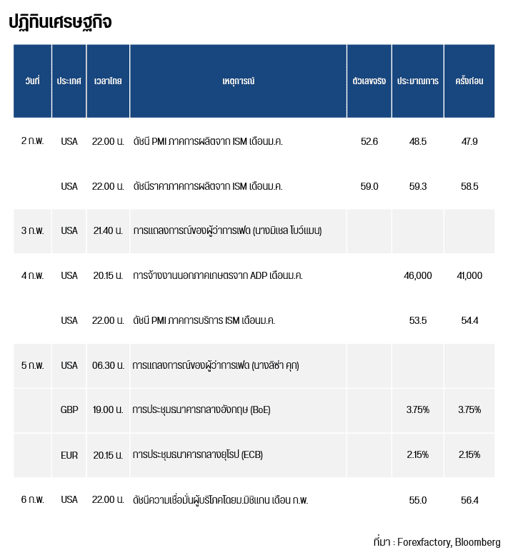 คืนนี้เวลา 20.15 น. สหรัฐฯ เผยการจ้างงานนอกภาคเกษตรจาก ADP เดือนม.ค. และ 22.00น. เผยดัชนี PMI ภาคการบริการ ISM เดือนม.ค.