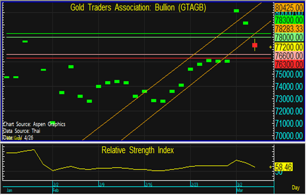 ราคาทองในประเทศมีการปรับตัวลงตามทองโลก ในขณะที่ค่าเงินบาทเริ่ม Sideway จึงแนะนำทยอยขายตามแนวต้านที่ระดับ 78,000 และทยอยซื้อตามแนวรับที่ 76,600 บาท แต่หากราคาหลุดแนวรับที่ 76,300 บาท ลงไป แนะนำขายตัดขาดทุน
