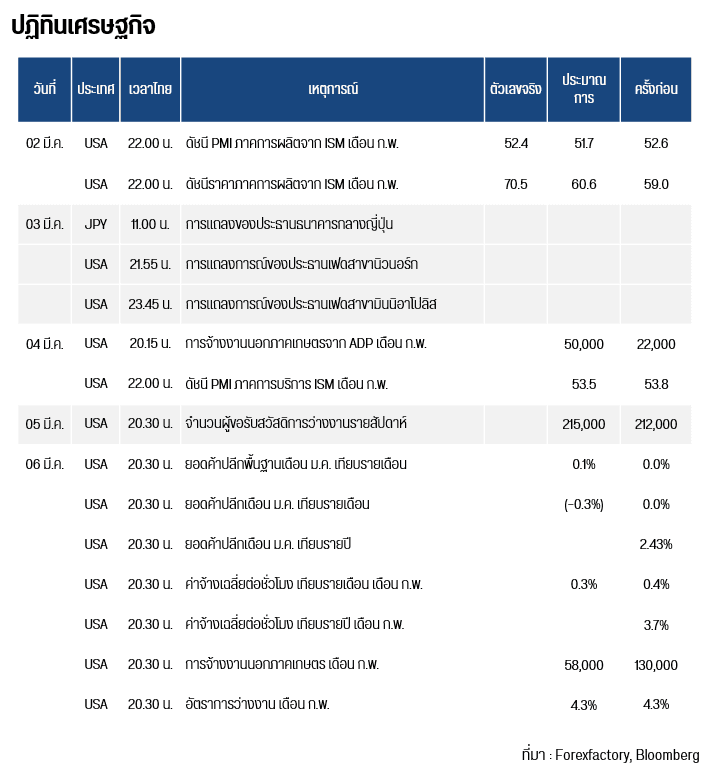 คืนนี้เวลา 20.15 น. สหรัฐฯ เผยการจ้างงานนอกภาคเกษตรจาก ADP เดือน ก.พ. และเวลา 22.00 น. เผยดัชนี PMI ภาคการบริการ ISM เดือน ก.พ.