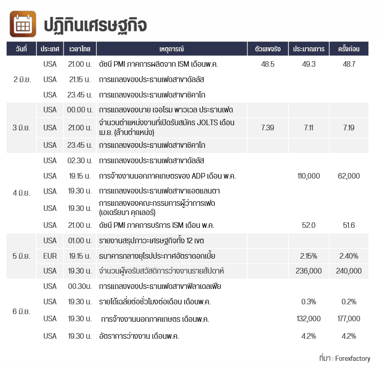 คืนนี้ สหรัฐฯ มีประกาศการตัวเลขการจ้างงานนอกภาคเกษตรของ ADP เดือน พ.ค. และ ดัชนี PMI ภาคบริการ ISM เดือน พ.ค.