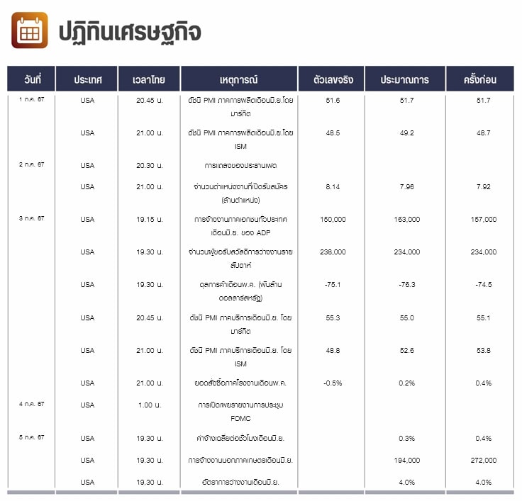 คืนนี้สหรัฐจะเปิดเผยการจ้างงานนอกภาคเกษตรเดือนมิ.ย. ตลาดคาดว่า จะเพิ่มขึ้น 194,000 ตำแหน่ง จาก 272,000 ตำแหน่ง นอกจากนี้จะเปิดเผยค่าจ้างเฉลี่ยต่อชั่วโมงเดือนมิ.ย. และอัตราการว่างงานเดือนมิ.ย.