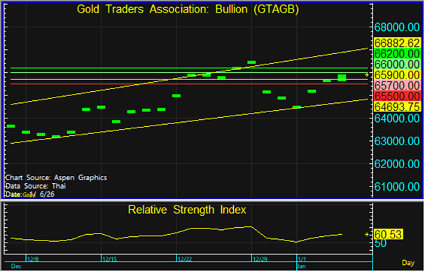 ราคาทองในประเทศมีแนวโน้มฟื้นตัวขึ้นตามทองโลก ในขณะที่ค่าเงินบาทแข็งค่า จึงแนะนำทยอยขายตามแนวต้านที่ระดับ 66,000 และทยอยซื้อตามแนวรับที่ 65,700 บาท แต่หากราคาหลุดแนวรับที่ 65,500 บาท ลงไป แนะนำขายตัดขาดทุน