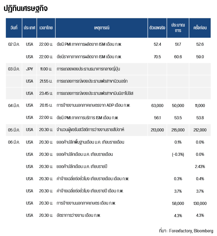 คืนนี้เวลา 20.30 น. สหรัฐฯ เผยยอดค้าปลีกพื้นฐานเดือน ม.ค. เทียบรายเดือน , ยอดค้าปลีกทั่วไป เดือน ม.ค. เทียบรายเดือน / รายปี , ค่าจ้างเฉลี่ยต่อชั่วโมง เทียบรายเดือน / รายปี เดือน ก.พ. , การจ้างงานนอกภาคเกษตร เดือน ก.พ. และ อัตราการว่างงาน เดือน ก.พ.