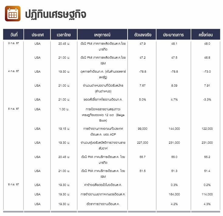 คืนนี้สหรัฐจะเปิดเผยการจ้างงานนอกภาคเกษตรเดือนส.ค.ตลาดคาดว่าจะเพิ่มขึ้น 164,000 ตำแหน่ง จากที่เพิ่มขึ้น 114,000 ตำแหน่ง อัตราการว่างงานเดือนส.ค. ตลาดคาดว่าจะลดลงสู่ระดับ 4.2% จาก 4.3% และค่าจ้างเฉลี่ยต่อชั่วโมงเดือนส.ค.