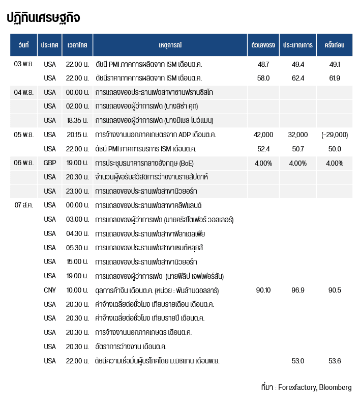 ทองโลกมีการฟื้นตัวขึ้นระยะสั้น จากการที่ตลาด CME FedWatch ได้ออกมาปรับคาดการณ์ จาก 62.0% เป็น 66.9% ว่าเฟดอาจลดดอกเบี้ย 0.25% ในเดือนธ.ค.นี้ ในขณะที่บริษัทในสหรัฐ ประกาศแผนเลิกจ้างพนักงานมากที่สุดในรอบกว่า 20 ปี ในเดือนตุลาคม โดยมีการประกาศเลิกจ้างพนักงานรวม 153,074 ตำแหน่ง ซึ่งมากกว่า 3 เท่าเมื่อเทียบกับเดือนต.ค. ปี 2024 และเป็นจุดสูงสุดนับตั้งแต่เดือน ต.ค. ปี 2003 จากกระแส AI เข้ามาแทนที่ตลาดแรงงาน ซึ่งอาจทำให้กำลังซื้อของผู้บริโภคในสหรัฐฯ อ่อนแอ อย่างไรก็ตาม ดัชนีเงินดอลลาร์ (DXY) ได้มีแนวโน้มฟื้นตัวขึ้นสู่ระดับบริเวณ 99.82 หน่วย จาก 99.69 หน่วย อีกทั้งบอนด์ยีลด์สหรัฐฯ อายุ 10 ปี มีแนวโน้มทรงตัวบริเวณ 4.10% ในขณะที่สำนักงานศุลกากรของจีน (GAC) ระบุว่า ยอดส่งออกแร่หายากของจีนในเดือนต.ค. เพิ่มขึ้น 9% จากเดือนก.ย. แตะระดับ 4,343.5 เมตริกตัน ซึ่งถือเป็นการเพิ่มขึ้นรายเดือนครั้งแรกในรอบ 4 เดือน หลังจากการพบปะระหว่างปธน.โดนัลด์ ทรัมป์ และ ปธน.สี จิ้นผิง ณ เกาหลีใต้ ซึ่งเป็นการแสดงให้เห็นถึงการลดระดับความตึงเครียดทางการค้าระหว่างมหาอำนาจทั้ง 2 ประเทศ