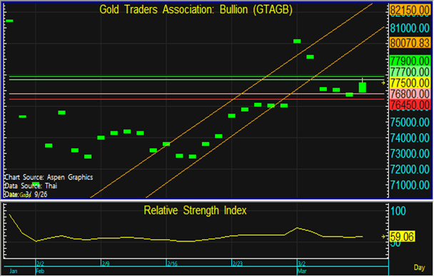 ราคาทองในประเทศมีการแกว่งตัวขึ้น / ลงตามทองโลก ในขณะที่ค่าเงินบาทอ่อนค่า จึงแนะนำทยอยขายตามแนวต้านที่ระดับ 77,700 และทยอยซื้อตามแนวรับที่ 76,800 บาท แต่หากราคาหลุดแนวรับที่ 76,450 บาท ลงไป แนะนำขายตัดขาดทุน