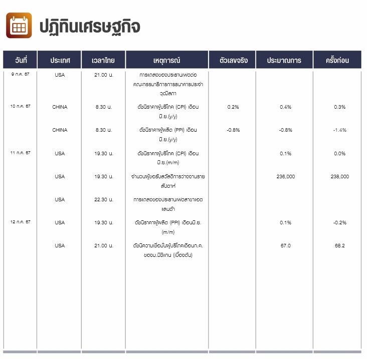 คืนนี้สหรัฐจะเปิดเผยดัชนีราคาผู้บริโภค (CPI) เดือนมิ.ย. ตลาดคาดว่าจะเพิ่มขึ้น 0.1% จาก 0.0% เมื่อเทียบรายเดือน หรือเพิ่มขึ้น 3.1% จาก 3.3% เมื่อเทียบรายปี และจำนวนผู้ขอรับสวัสดิการว่างงานรายสัปดาห์ ตลาดคาดว่าจะลดลง 2,000 รายสู่ 236,000 ราย