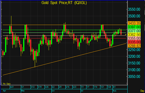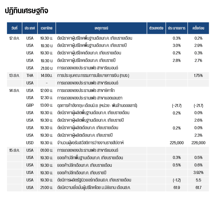 ทองโลกเริ่มมีการปรับฐานลง คาดการณ์ตลาดกำลังจับตาท่าทีภาษีนำเข้าทองคำของสหรัฐฯ – สวิตฯ ที่ถูกตั้งกำแพงภาษีสูงถึง 39% แม้ว่าภาษีดังกล่าวจะ”มีผลบังคับใช้แล้ว” แต่สวิตฯ ยังคงพยายามเจรจากับสหรัฐฯ ในขณะที่นักเศรษฐศาสตร์จากธนาคารยักษ์ใหญ่สวิตฯ อย่าง UBS คาดการณ์ว่า ภาษีศุลกากรกำลังผลักดันให้อัตราเงินเฟ้อฟื้นฐานสหรัฐฯ เร่งตัวขึ้นจาก 2.9% ในเดือน มิ.ย. เป็น 3.5% ภายในสิ้นปีนี้ อีกทั้งทางฝั่ง Goldman Sachs คาดการณ์ว่าดัชนีการบริโภคส่วนบุคคลสหรัฐฯ อาจขยายตัวขึ้นสู่ระดับ 3.2% เมื่อเทียบกับเดือน ธ.ค. ปีก่อนหน้าที่ 2.6% จากข้อมูลข้างต้น ส่งผลให้ตลาด CME FedWatch คาดการณ์ว่าเฟดจะลดอัตราดอกเบี้ย0.25% ในเดือนก.ย. ลดลงต่ำกว่า 90% เหลือ 88% อย่างไรก็ตาม นักเศรษฐศาสตร์จาก JP Morgen มีมุมมองว่า การที่ปธน.ทรัมป์ส่งนาย สตีเฟน มิแรน เป็นผู้ว่าการเฟดชั่วคราว รวมถึงตลาดแรงงานที่อ่อนแอ อาจทำให้เฟดต้องตัดสินใจลดดอกเบี้ย 0.25% ในเดือนก.ย. ปีนี้ ในขณะที่ ทางฝั่งรัฐบาลอินเดีย เปิดเผยในวันนี้ว่า สินค้าส่งออกของอินเดียไปยังสหรัฐฯ ประมาณ 55% จากเดิมที่ 50% จะถูกเรียกเก็บภาษีจากสหรัฐฯ