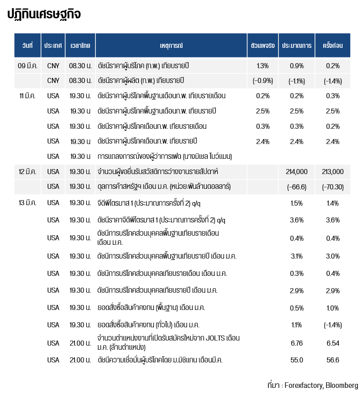 ทองโลกยังคงทรงตัวในกรอบแนวรับ / ต้าน จากการที่ดัชนีเงินดอลลาร์ (DXY) มีแนวโน้มทรงตัวที่ระดับ 99.33 หน่วย อีกทั้งบอนด์ยีลด์สหรัฐฯ อายุ 10 ปี ยังคงทรงตัวที่ระดับ 4.22% ในขณะที่ตลาดยังคงจับตาท่าทีของปธน.ทรัมป์ที่มีต่ออิหร่าน เนื่องจากทรัมป์ได้กล่าวว่าสงครามจะจบลงในไม่ช้า แต่ก็ส่งสัญญาณว่าสหรัฐฯ จะยังคงปฏิบัติการต่อไปตราบเท่าที่จำเป็นเพื่อให้บรรลุวัตถุประสงค์ ในขณะที่ทางฝั่งอิหร่านได้รายงานยอดผู้เสียชีวิตพุ่งเกิน 2,440 ราย โดยอิหร่านกล่าวหาว่าสหรัฐฯ ต้องรับผิดชอบต่อการโจมตีโรงเรียนในอิหร่านซึ่งทำให้มีผู้เสียชีวิตถึง 175 ราย นอกจากนี้ ทรัมป์ยังได้เปิดตัวการสอบสวนทางการค้าครั้งใหม่ โดยอาศัยอำนาจตาม มาตรา 301 (Section 301) ของกฎหมายการค้าปี 1974 ซึ่งอนุญาตให้ประธานาธิบดีสามารถจัดเก็บภาษีศุลกากรต่อประเทศที่มีพฤติกรรมเลือกปฏิบัติหรือขัดขวางการพาณิชย์ของสหรัฐฯ ซึ่งครอบคลุมประเทศคู่ค้ากว่า 60 ประเทศ และอาจทำให้สงครามทางด้านภาษีการค้า อาจกลับมาร้อนระอุอีกครั้ง อย่างไรก็ตาม สถานการณ์ช่องแคบฮอร์มุซอาจกระตุ้นให้ราคาน้ำมันดิบสูงขึ้น โดย Goldman Sachs (GS) ได้ปรับเพิ่มคาดการณ์ราคาน้ำมันดิบเบรนท์ (Brent) และเวสต์เท็กซัส (WTI) ในไตรมาส 4 ปี 2569 ขึ้นสู่ระดับ 71 และ 67 ดอลลาร์ / บาร์เรล ตามลำดับ จากเดิมที่ระดับ 66 และ 62 ดอลลาร์ / บาร์เรล ซึ่งอาจส่งผลให้เงินเฟ้อในอนาคตพุ่งสูงขึ้น และเป็นเหตุให้ดอลลาร์แข็งค่า ราคาทองร่วงลงในภายหลังได้